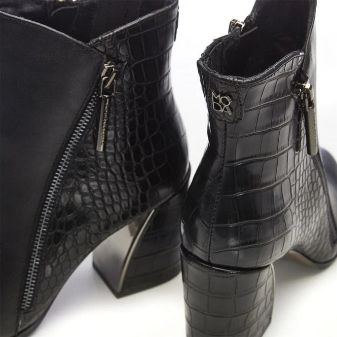 Your new favourite wide fit boot. Amy features a stunning curved block heel with a metallic inner, the contrasting textures on the shoe add further detail whilst still leaving it effortless to style. Complete with a functional inside zip and a decorative outside zip. Style with leather trousers and a blouse.