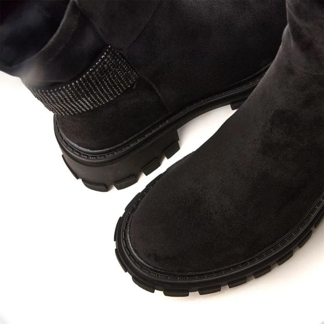 Add a new look to your outfits with Arilen. Complete with a heavy cleated sole and soft round toe, the glitz strap adds a suble touch of glamour whilst leaving the boot effortless to style. The stretch back feature allows for a flawless fit on the ankle for a wear that feels as good as it looks. Complete with padded sock and inside zip. If you wear a half size, we recommend sizing down.