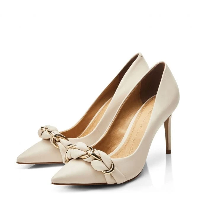 Update your occasion wear with Julyssa. Featuring a sleek pointed toe and stiletto heel, the sweeping curve of the shoe adds to the impact of this court shoe. Complete with interlaced chain detail to add a touch of detail. The leather sock and lining ensure the style feels as good as it looks. If you wear a half size, we recommend sizing up.