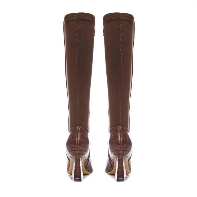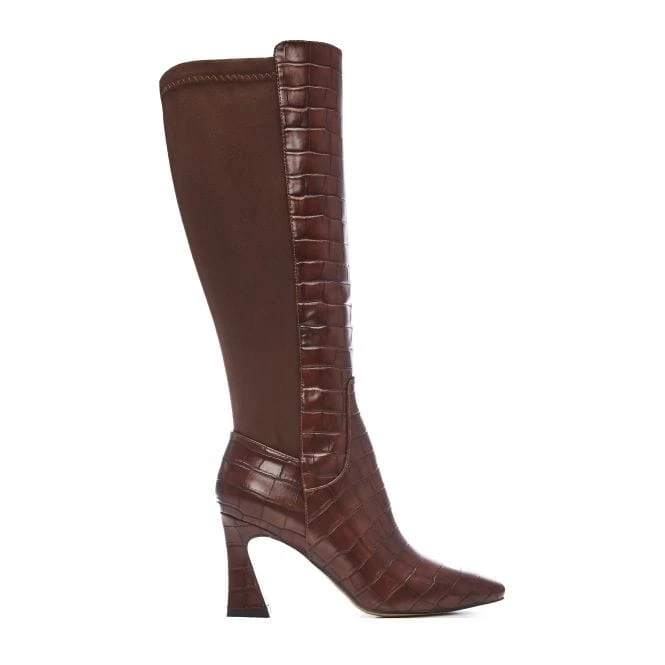 Show up in style with Sarisa. Featuring a stunning swoosh heel knee-high boot is the perfect addition to your shoe collection. The croc effect will effortlessly add texture, whilst the faux fur lining will ensure they feel as glamorous as they look. Style with knitwear.