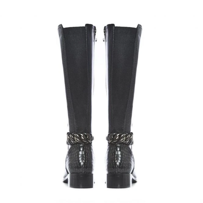 Introducing Whitley. The chunky chain detail adds a new element to the knee-high boot. Complete with a soft faux fur lining and an elastic back panel to let the boot move with you, ensuring it feels as good as it looks. Style with knitwear.